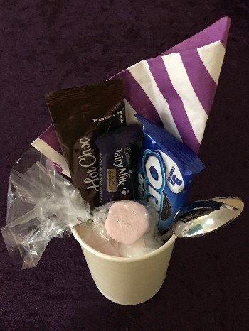 Plus our enticing Snack Bar which includes for each child: a candy box, breakfast bowl, hot chocolate and cookies, pretzels & treat cup, as described below*: